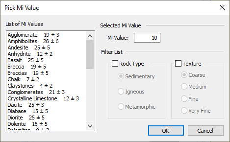 • simply select a rock type from the list at the left of the dialog, and the corresponding mi value will be loaded into the edit box at the top of the dialog.