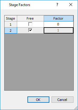 - Check the “Stage displacements” box and click on the Stage Factors button. In the dialog, change the factor of Stage 1 to zero. Check the Free box for Stage 2.