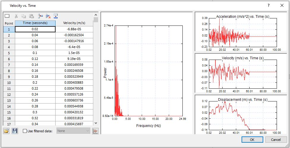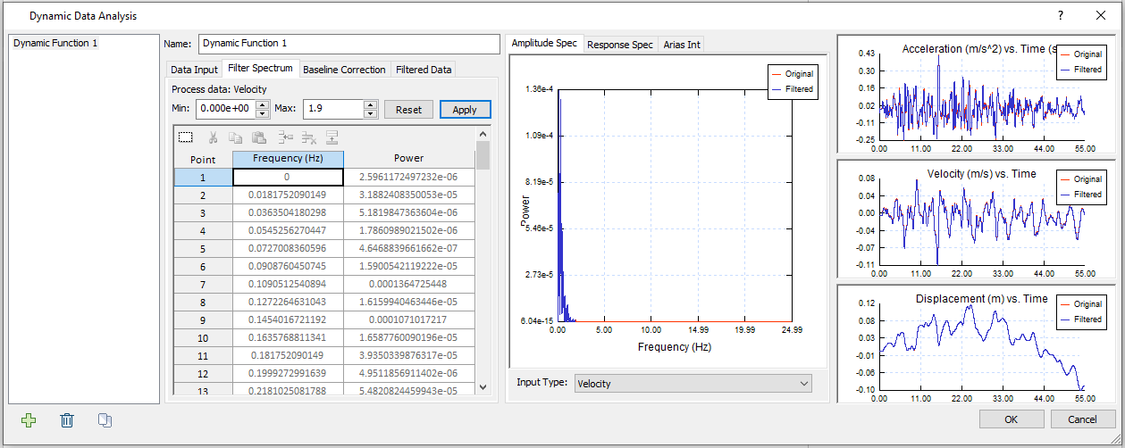 - Make sure Input Type = Velocity under the Amplitude Spectrum tab, to show the “Power vs. Frequency (Hz)” plot base on velocity. The dialog should look as follows:
