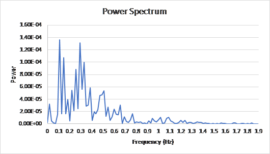 Since most of the power occurs between 0 and 1.9 Hz, the power greater than 1.9 Hz can be filtered out. To further investigate the power distribution less than 1.9 Hz, the Power vs. Frequency (Hz) is plotted in Excel as shown below: