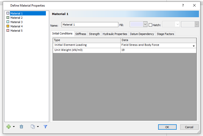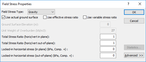 - Leave the horizontal stress ratios as 1, meaning hydrostatic initial stresses (i.e. horizontal stress = vertical stress). If the actual horizontal stress ratio is known, use this information. However, the horizontal stress distribution within a slope is rarely known, so leaving the default hydrostatic stress field has shown to be a good assumption. Select OK.