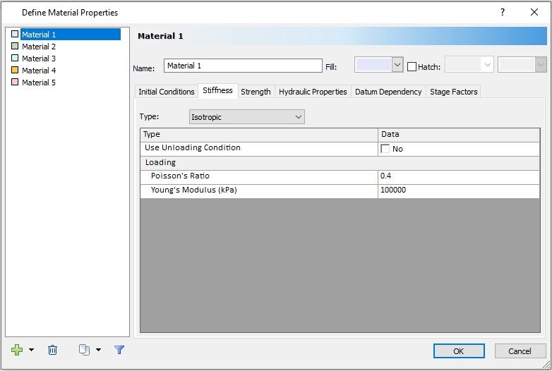 - Enter 100 000 kPa for the Young’s Modulus and 0.4 for the Poisson ratio.