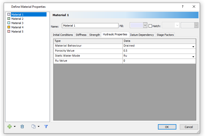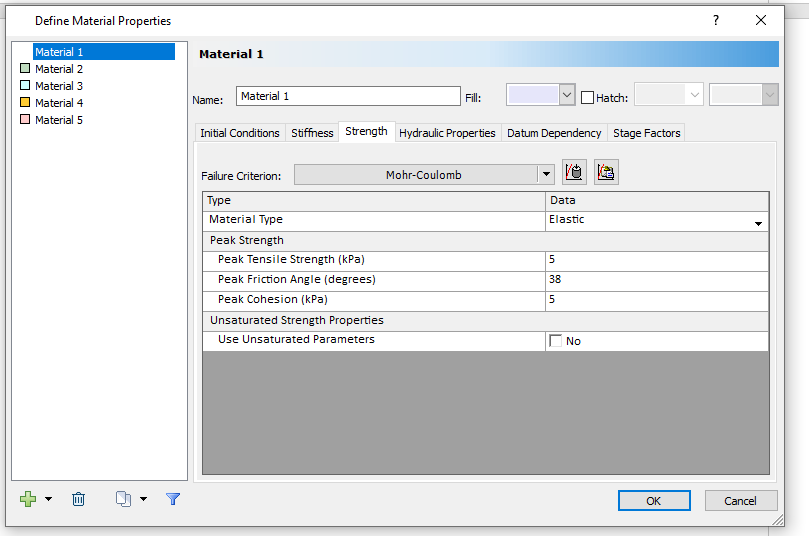 - Set the Material type to Elastic. Set the peak Tensile Strength and the peak Cohesion to 5 kPa.
