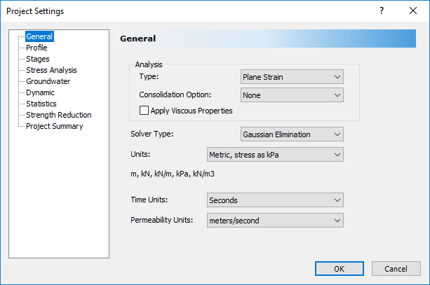 - Under the General page, define the units as being “Metric, stress as kPa”. For this tutorial, the Time Units need to be specified as "Seconds".