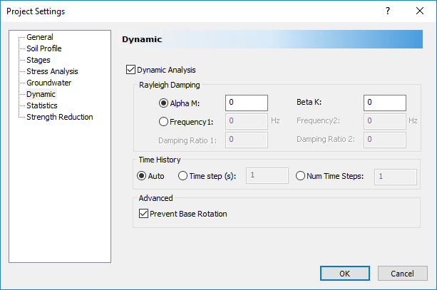 - Select the Dynamic tab. Check the Dynamic Analysis check box to enable the dynamic analysis to be conducted on specific stages. On this tab, the general dynamic parameters are defined, such as Rayleigh Damping. Let’s start with an undamped model. Set Alpha M = 0, Beta K = 0.