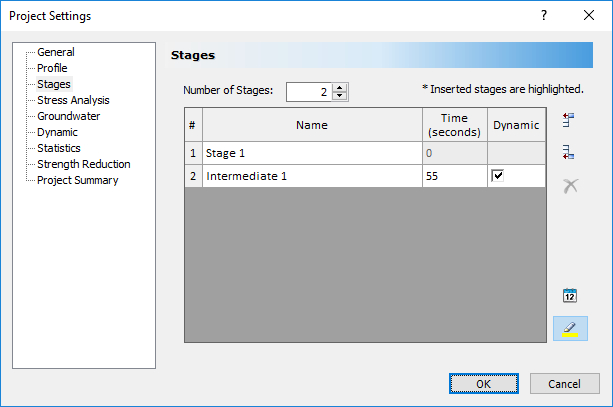 In addition to an initial static stage, a dynamic stage will be added to see the final state of the model. The earthquake acceleration history has a duration of 60 seconds, but this tutorial only examines the intermediate stage after 55 seconds. - Select the Stages tab. The first stage in the analysis is, by default, always a static analysis stage. Insert a new stage and check the Dynamic check box. In the time column, the simulation time at which each stage will end is inserted. Change the time of the second stage to 55 seconds. Rename the second stage to “Intermediate 1.”