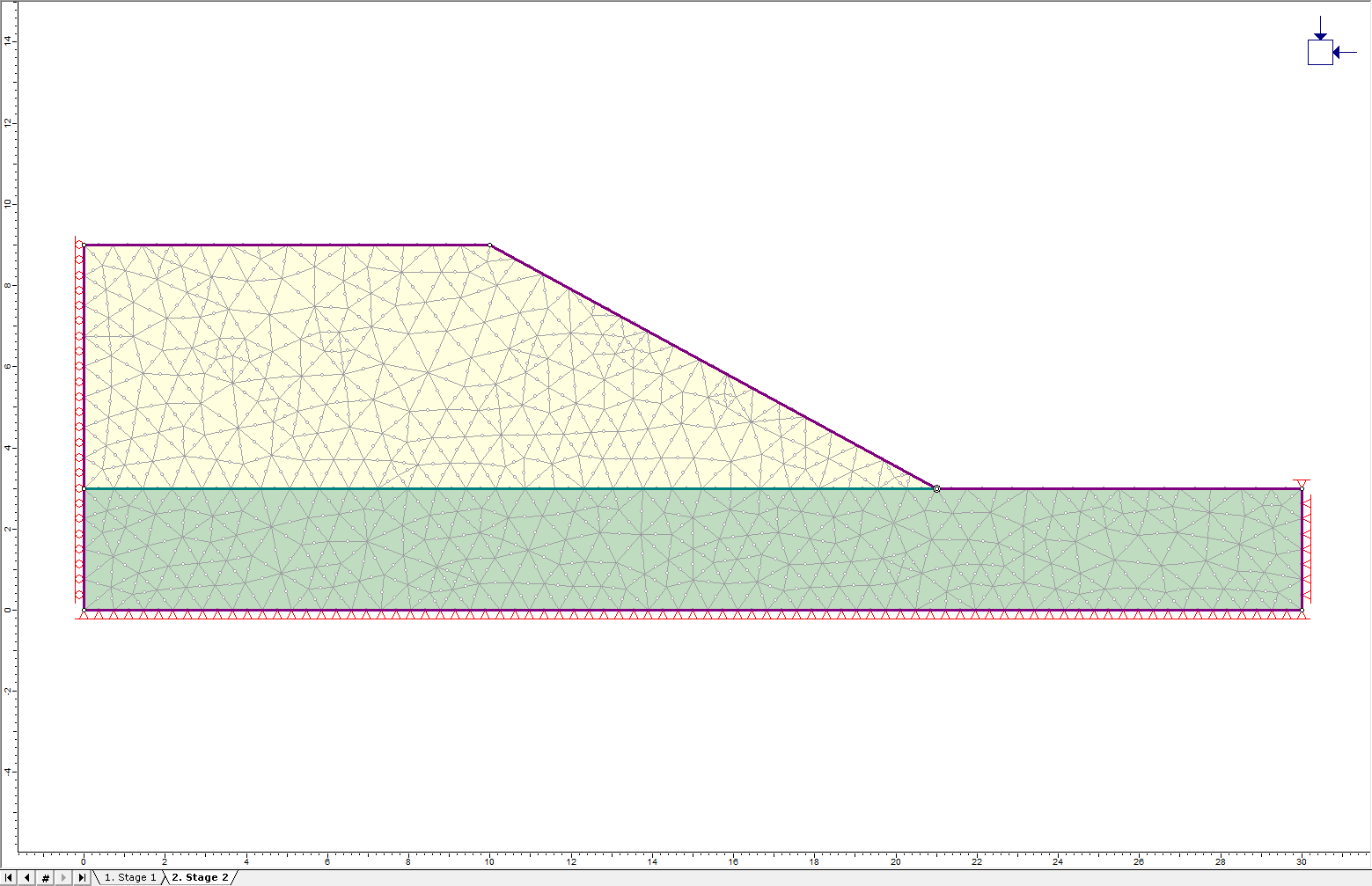 Building the model with multiple stages and with slip is more realistic than the previous model analyzed in this tutorial that was constructed in one stage without slip. The first stage will consist of only the clay layer. In the second stage, we will then add the geogrid and the sand fill embankment. We do this by applying the following steps: