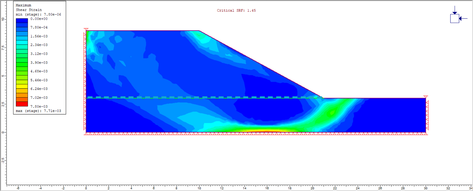 The following screen shows the Maximum Shear Strain contours at the critical Strength Reduction Factor: