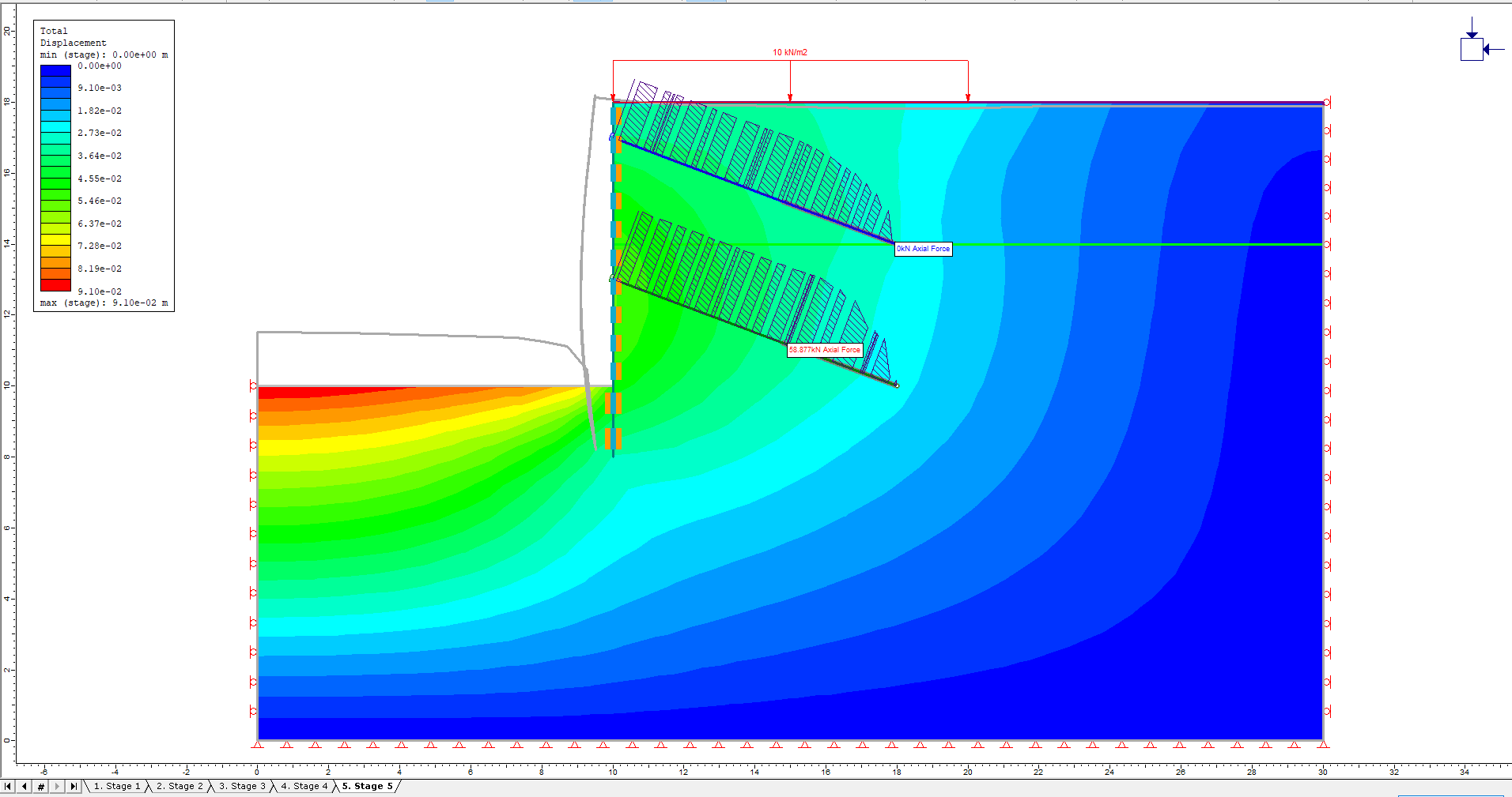 - Click OK to close the dialog. Click OK to close the Add Distributed Load dialog. Select the top boundary just to the right of the excavation and hit Enter to apply the load. The final model for Stage 5 should now look like this: